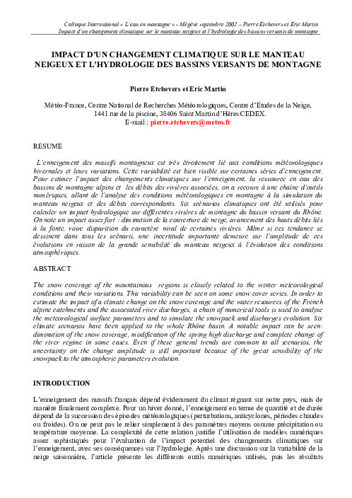 L'enneigement des massifs montagneux est très étroitement lié aux conditions météorologiques hivernales et leurs variations. Cette variabilité est bien visible sur certaines séries d'enneigement. Pour estimer l'impact des changements climatiques sur l'enneigement, la ressource en eau des bassins de montagne alpins et les débits des rivières associées, on a recours à une chaîne d'outils numériques, allant de l'analyse des conditions météorologiques en montagne à la simulation du manteau neigeux et des débits correspondants. Six scénarios climatiques ont été utilisés pour calculer un impact hydrologique sur différentes rivières de montagne du bassin versant du Rhône. On note un impact assez fort : diminution de la couverture de neige, avancement des hauts débits liés à la fonte, voire disparition du caractère nival de certaines rivières. Même si ces tendance se dessinent dans tous les scénarii, une incertitude importante demeure sur l'amplitude de ces évolutions en raison de la grande sensibilité du manteau neigeux à l'évolution des conditions atmosphériques