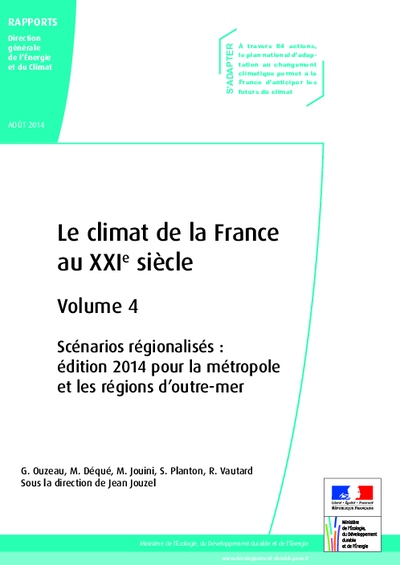 fournit une estimation des tendances d'évolution du climat pour le XXIème siècle en France, quantifiée et analysée. Il se base sur les données régionalisées issues de la modélisation citée ci-après, issues des derniers scénarios climatiques proposés par le GIEC.