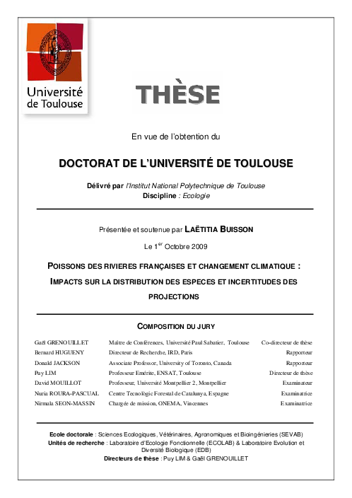 Déterminants environnementaux de la distribution spatiale des espèces de poisson de rivière/ Modélisation des patrons actuels et futurs de distribution : incertitudes et approches d'ensembles/ Evaluation des impacts potentiels du changement climatique sur les poissons des rivières françaises