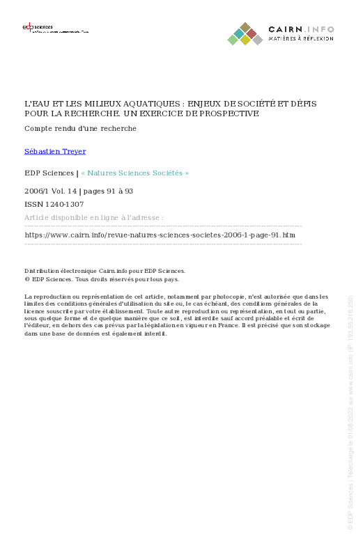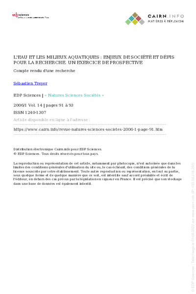 L'eau et les milieux aquatiques : enjeux de société et défis pour la recherche. Un exercice de prospective