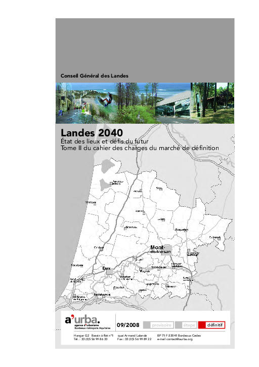 Démarche stratégique et prospective du Conseil Général des Landes. Le document présente un état des lieux et une lisibilité des enjeux en présence pour aborder l'avenir des Landes à l'horizon 2040.