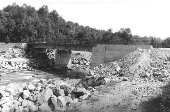 Photographies du pont de la RD35, à la suite de son affaissement en janvier 1981 (gauche) et à la suite des réparations en juin1981 (droite) (Conseil départemental 64)