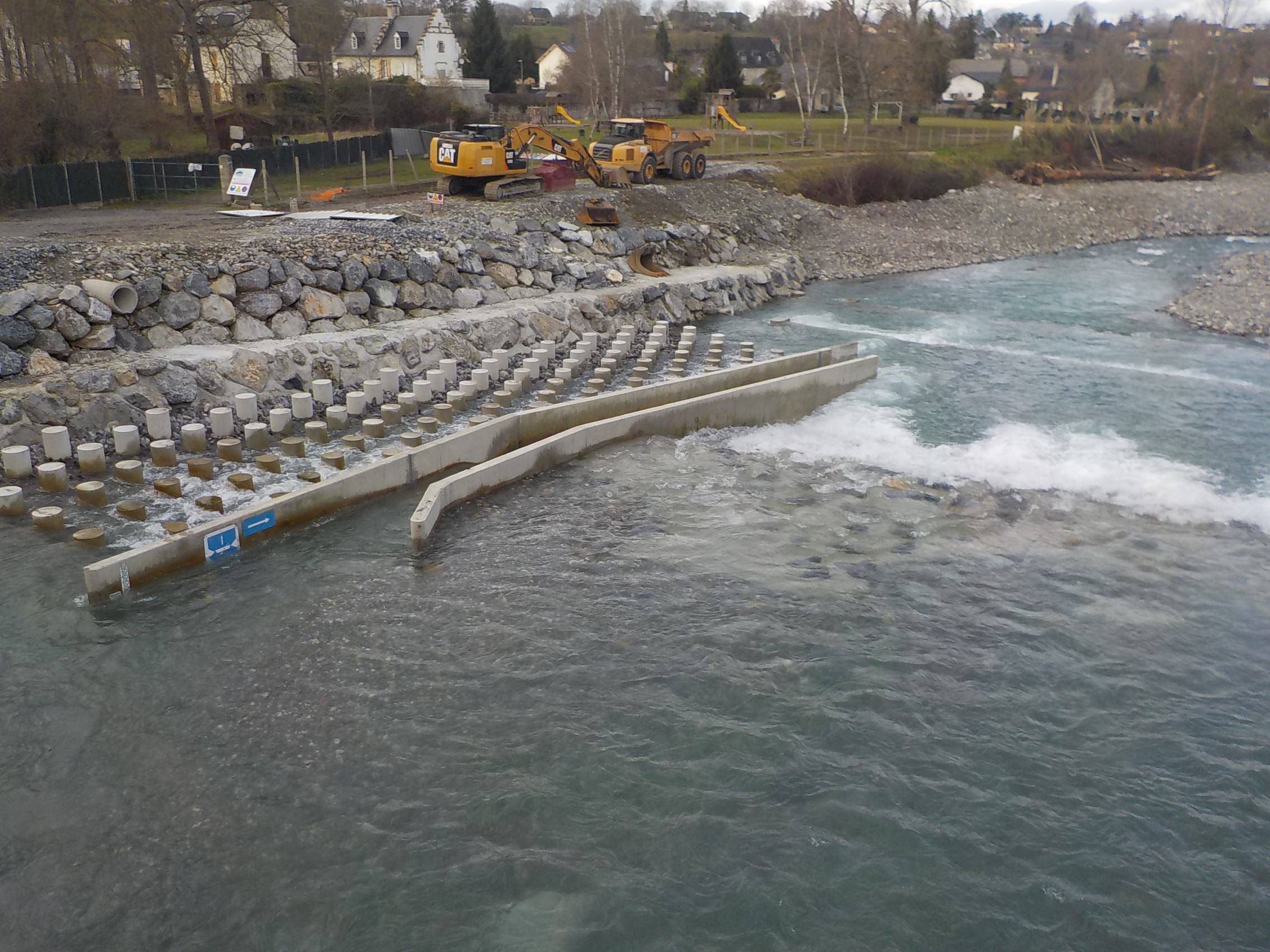 - construire une nouvelle passe à poissons en rive gauche. C’est une rampe en enrochements, munie de singularités (plots en béton) ;