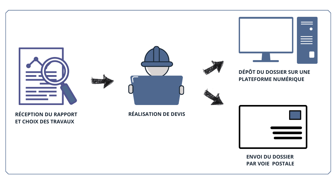 Sur la base de ce choix, le propriétaire doit contacter des entreprises en capacité de réaliser les travaux pour obtenir un ou plusieurs devis (pièces nécessaires du dossier de demande d'aide).