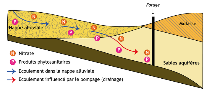 - La mise en contact des nappes profondes avec des nappes phréatiques polluées. Les pompages intensifs dans la nappe des sables infra-molassiques, localement située à plus faible profondeur, peuvent créer une dépression favorisant le drainage des eaux de la nappe alluviale et des polluants ;