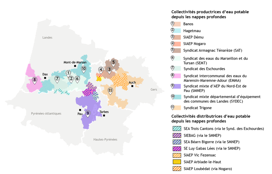 Sur le territoire, plusieurs collectivités et près de 70 000 habitants dépendent exclusivement des nappes profondes pour l’AEP. Ces collectivités n’ont accès à aucune autre ressource suffisante en qualité et en quantité et ne sont pas interconnectées avec d’autres collectivités. C’est le cas du secteur du Tursan du Syndicat des eaux du Marseillon et du Tursan et de la SIAEP de Nogaro dont 100% de l’eau provient de la nappe des sables infra-molassiques. Les secteurs du SYDEC de Peyrehorade, Roquefort, Sarbazan et ZA d’Arue ainsi que la commune de Banos dépendent eux à 100% de l’eau de la nappe du Crétacé. Enfin, le SIAEP des Eschourdes dépend à 100% des nappes profondes en provenance des nappes de l’Eocène (dont SIM) et du Paléocène.