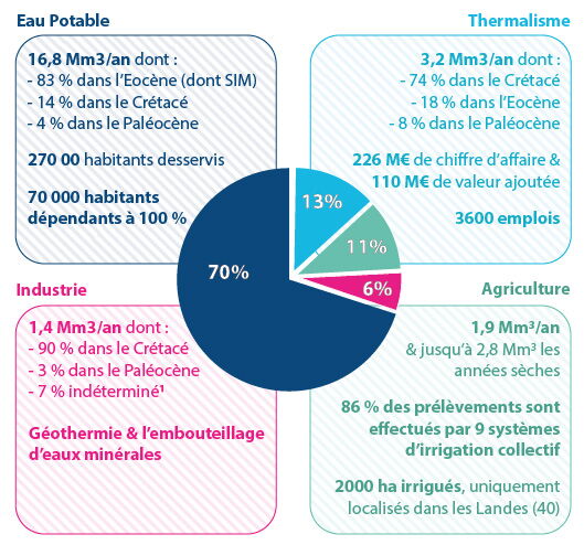 - L’alimentation en eau potable, qui constitue l’exploitation principale des nappes profondes, en particulier pour la nappe des sables infra-molassiques où elle représente 90% des volumes prélevés. Au total, ce sont près de 17 millions de mètres cubes par an qui sont prélevés dans les nappes profondes, pour alimenter 270 000 habitants répartis sur quatre départements : les Landes, le Gers, les Pyrénées-Atlantiques et les Hautes-Pyrénées ;