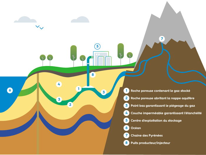 Pendant la période de faible consommation énergétique (l’été), le gaz provenant de gisements lointains (mer du Nord, Russie, Algérie, etc.) acheminé en France par les gazoducs du réseau de transport est injecté dans la roche « réservoir » par les puits d’exploitation. Pendant la période de forte consommation énergétique (l’hiver), le gaz est soutiré par les puits d’exploitation et distribué pour satisfaire l’augmentation saisonnière de la demande.