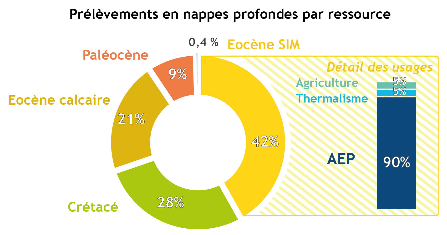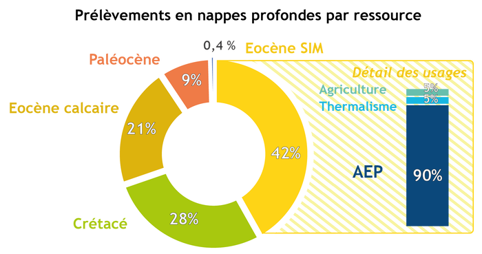 Les prélèvements en nappes profondes sur le territoire sollicitent les aquifères de l’Eocène, du Paléocène et du Crétacé. A titre d’exemple, en 2016, ce sont 24,2 millions de mètres cubes qui ont été prélevés.