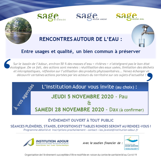 Rencontres autour de l'eau : entre usages et qualité, un bien commun à préserver - jeudi 5 (Pau) et samedi 28 novembre (Dax)