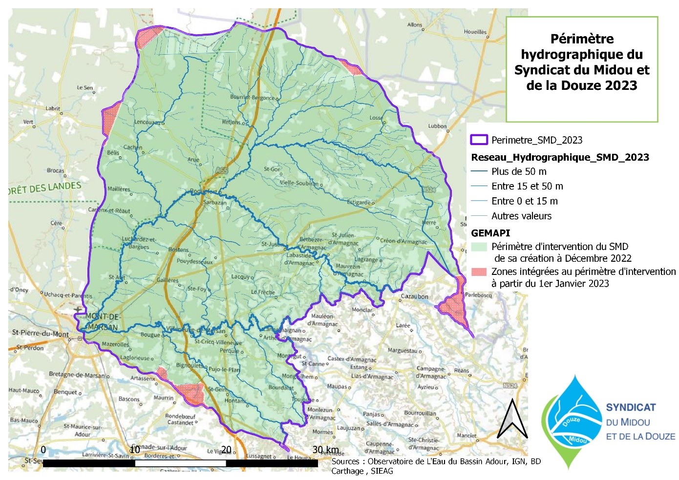 Parallèlement à l'étude stratégique et à la définition du PPG, le syndicat a mené une démarche de révision de ses statuts, intégrant notamment la communauté de communes du Pays Grenadois. La carte d'évolution du périmètre du SMD est visualisable via ce lien.