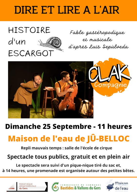 Dans le cadre du festival Dire et lire à l'air organisé par la Médiathèque départementale du Gers, la Médiathèque Bastides et Vallons du Gers propose le spectacle Histoire d'un escargot, fable gastéropodique et musicale de LaClakCompagnie, à la Maison de l'eau dimanche 25 septembre à 11h