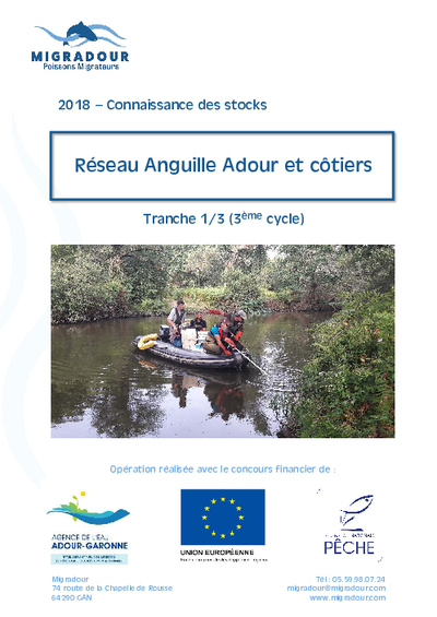 La campagne 2018 de mise en œuvre du Réseau spécifique Anguille « Adour et côtiers » s'est déroulée dans des conditions hydrologiques particulièrement compliquées, mais l’ensemble des opérations prévues a pu être réalisé. Elle s'insère dans le réseau Indicang et le Plan National Anguille. Les densités d'anguilles diminuent plus on s'éloigne de la mer. La tendance de biomasse d'anguilles argentées est toujours à la baisse, sur le bassin Adour et Côtiers comme sur le territoire national.