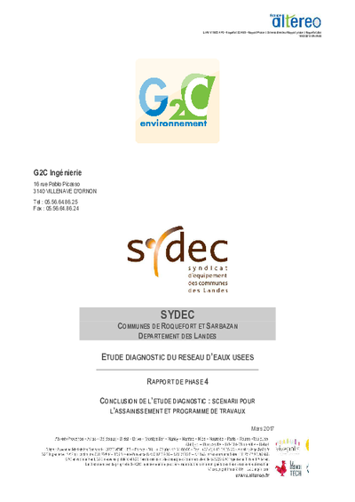 Communes de Roquefort et Sarbazan - Etude diagnostic du réseau d'eaux usées - Rapport de phase 4 - Conclusion de l'étude diagnostic : scenarii pour l'assainissement et programme de travaux.