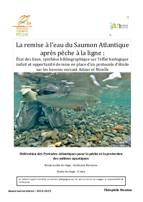 La remise à l'eau du Saumon atlantique après pêche à la ligne : état des lieux, synthèse bibliographique sur l'effet biologique induit et mise en place d'un protocole d'étude sur les bassins versant Adour et Nivelle.