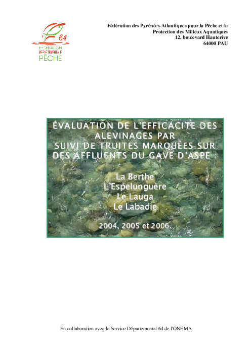 Evaluation de l'efficacité des alevinages par suivi de truites marquées sur les affluents du gave d'Aspe : la Berthe, l'Espelunguère, le Lauga, le Labadie. 2004, 2005 et 2006.