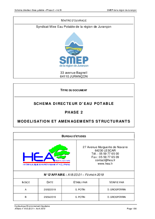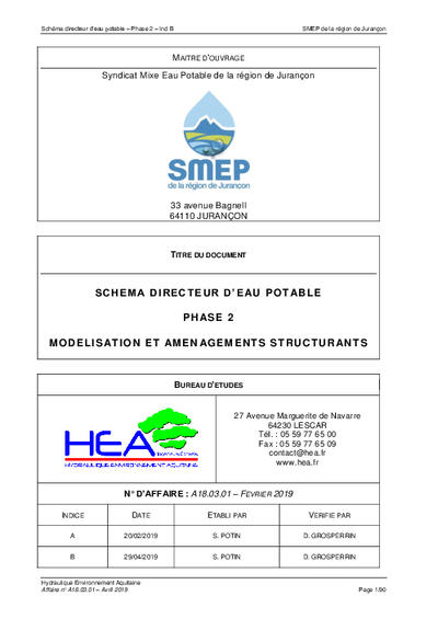 SMEP de la région de Jurançon - Schéma directeur d'eau potable - Phase 2 - Modélisation et aménagements structurants