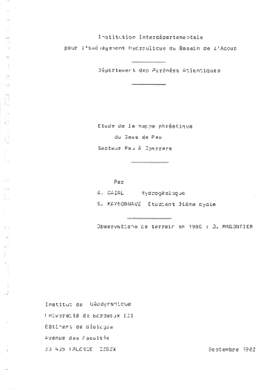 Etude de la nappe phréatique du GAVE DE PAU. Secteur de PAU à COARRAZE.