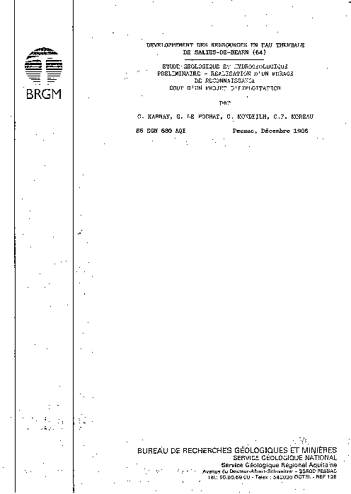 Développement des ressources en eau thermale de SALIES-DE-BEARN (64). Etude géologique et hydrogéologique préliminaires - Réalisation d'un forage de reconnaissance et coût d'un projet d'exploitation.