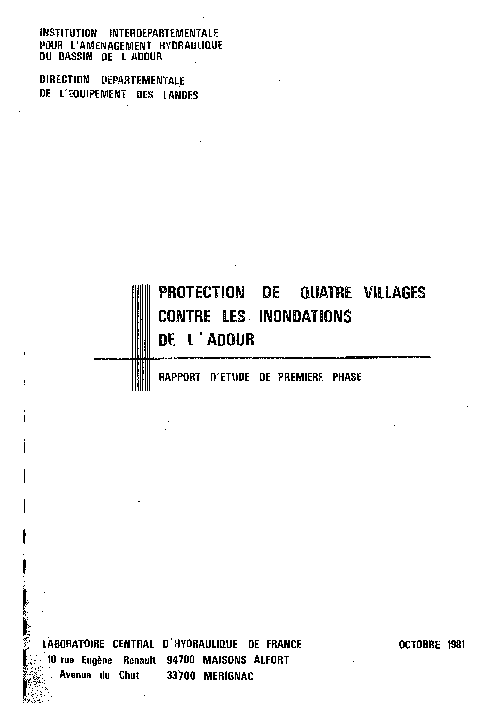 Protection des 4 villages (SAINT-JEAN-DE-LIER, GOUSSE, YZOSSE, TETHIEU) contre les inondations de l'Adour. 1.Rapport de 1ère phase. 2.Rapport de 2ème phase. Avant-projet sommaire.