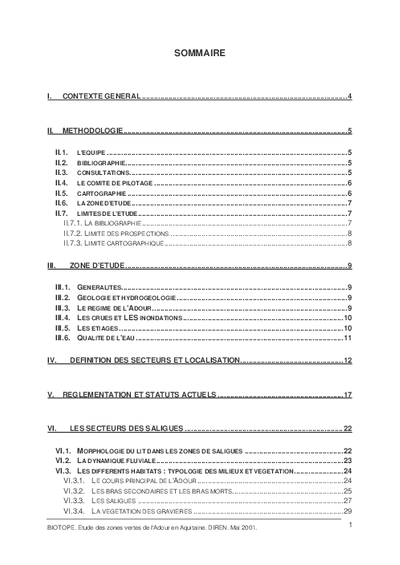 Le SDAGE Adour Garonne a inscrit quatre milieux de l'Adour en zones vertes. L'objet de la présente étude est d'affiner la délimitation des zones au 1/25000, de cartographier les écosystèmes qui les composent, d'évaluer leur intérêt patrimonial, leur fonctionnement et leurs perspectives d'évolution, de préciser les facteurs écologiques explicatifs, d'inventorier les principales activités humaines en interactions avec les milieux.