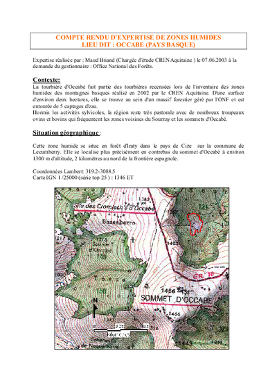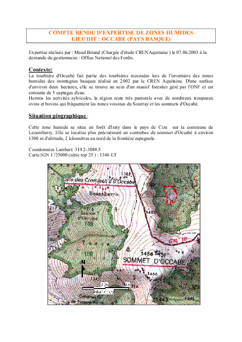 Compte-rendu d'expertise de zones humides. Lieu-dit "OCCABE" (PAYS BASQUE). Réseau SAGNE.