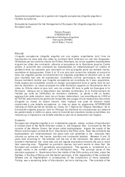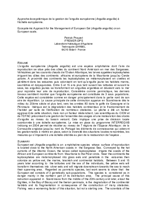 L'étude décrit d'abord la reproduction et les phases de développement et de colonisation des anguilles, puis aborde les mécanismes de dispersion vers les zones de grossissement, et analyse les causes d'effondrement des populations (action du climat, causes anthropiques). Le rapport conclut que la gestion de l'anguille ne peut se limiter à l'analyse par bassin, mais doit prendre en compte une approche écosystémique sur l'ensemble des écophases de l'espèce.