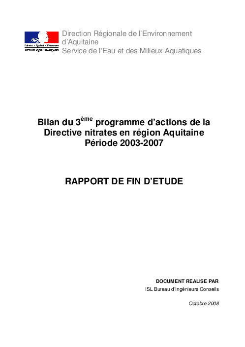 Bilan du 3ème programme d'actions de la directive nitrates en région Aquitaine. Période 2003-2007.