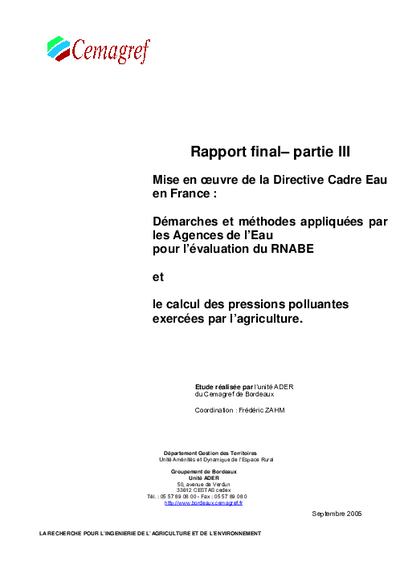 Successivement sont présentés la démarche développée par le CEMAGREF une synthèse des méthodologies développées par chaque Agence de l'Eau pour qualifier les masses d'eau superficielles en situation de RNABE, les méthodes d'évaluation des pressions liées aux macro-polluants ou micro-polluants d'origine agricole, un bilan quantitatif des masses d'eau en RNABE. La détermination du RNABE est réalisée en croisant l'état actuel des eaux avec l'évolution des pressions à l'horizon 2015.