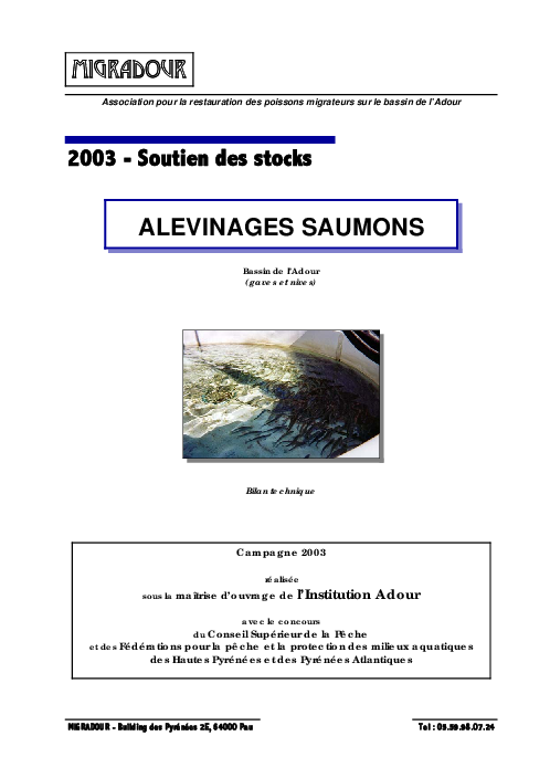 Alevinages saumons. Bassin de l'Adour : Gaves et Nives. Campagne 2003.