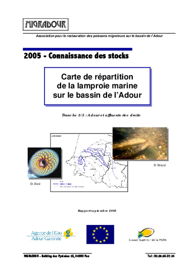 Les observations réalisées en 2005 ont permis de déterminer le linéaire colonisé par la lamproie marine : totalité du linéaire sur la Midouze jusqu'à la confluence avec l'Estampon sur la Douze (Roquefort), sur l'Arros jusqu'au moulin de Tillet à Plaisance du Gers, sur l'Adour au pont de Ju-Belloc. La zone de répartition est cartographiée au terme de trois années d'étude.
