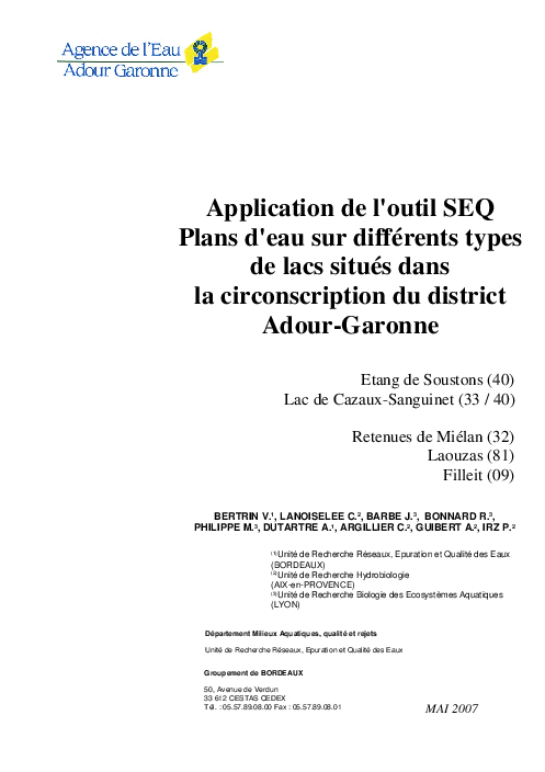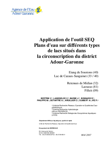 La présente étude concerne l'application de l'outil SEQ Plans d'eau dans différents lacs et retenues afin d'obtenir une évaluation de leur qualité physico-chimique et biologique, d'identifier les difficultés techniques liées au suivi des plans d'eau, de disposer d'éléments financiers pour définir les futurs programmes de mesures. Cinq lacs de plus de 50 hectares sont retenus dont les lacs de Cazaux-Sanguinet et de Soustons dans les Landes, de Miélan dans le Gers, de Laouzas dans le Tarn et de Filliet en Ariège. L'étude a permis la mise en oeuvre de nouvelles méthodes d'analyse et d'échantillonnage et l'évaluation de protocoles.