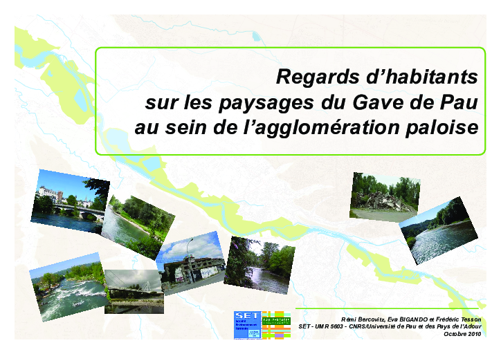 Ce travail de recherche prolonge une expérimentation menée sur la commune d'Artigueloutan. Il s'appuie sur une démarche d'enquête photographique en vue de comprendre le rapport des habitants à leurs paysages quotidiens et d'organiser la mobilisation habitante. Le questionnement est proposé autour de six thèmes : le paysage "vitrine", le Gave "intime", le Gave des loisirs, le Gave "dégradé", le paysage en mouvement, le Gave en perspectives. Trois idées se dégagent de cette recherche. Le Gave renvoie plus à des "paysages à vivre" qu'à des "paysages décors". Des lieux émergent au sein de cet espace. Des liens tels que l'accessibilité et les continuités physiques ou le Gave comme vecteur de lien social et mémoriel ont une dimension forte. La valorisation de l'accessibilité transversale ou longitudinale apparaît comme une préoccupation fondamentale. La diversité des espaces du plus aménagé au plus naturel, la mixité des usages possibles sont également mis en avant.