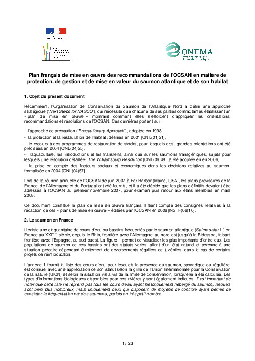 Plan français de mise en oeuvre des recommandations de l'OCSAN en matière de protection, de gestion et de mise en valeur du saumon atlantique et de son habitat.