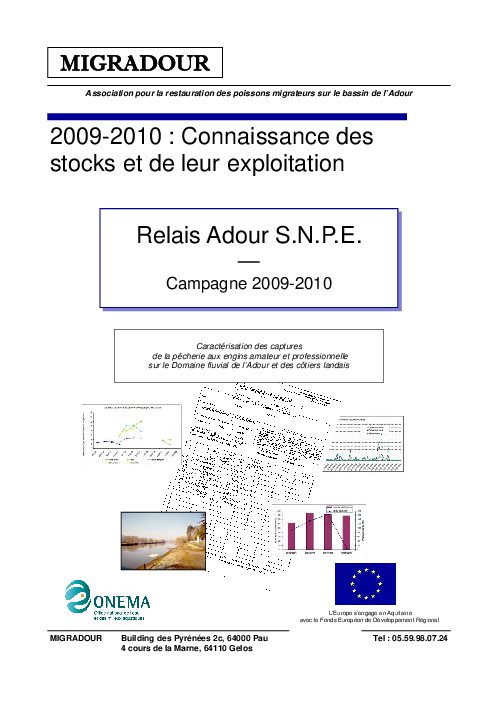 Le présent rapport rend compte du bilan du relais Adour SNPE pour la saison 2009-2010 Il décrit la zone géographique étudiée, la pratique de la pêche (espèces exploitées, catégories de pêcheurs, domaines exploités et droits de pêche). Les résultats de la saison sont présentés pour les pêcheurs professionnels et les pêcheurs amateurs.