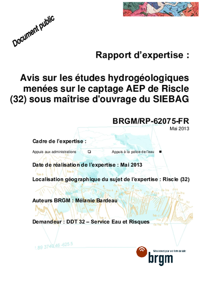 Rapport d'expertise. Avis sur les études hydrogéologiques menées sur le captage AEP de Riscle sous maîtrise d'ouvrage du SIEBAG.