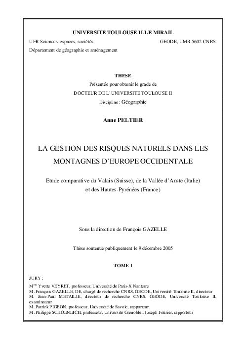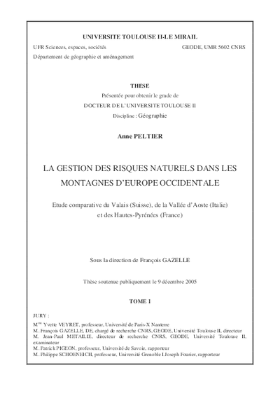 La gestion des risques naturels dans les montagnes d'Europe Occidentale. Etude comparative du Vallais (Suisse), de la Vallée d'Aoste (Italie) et des Hautes-Pyrénées (France).
