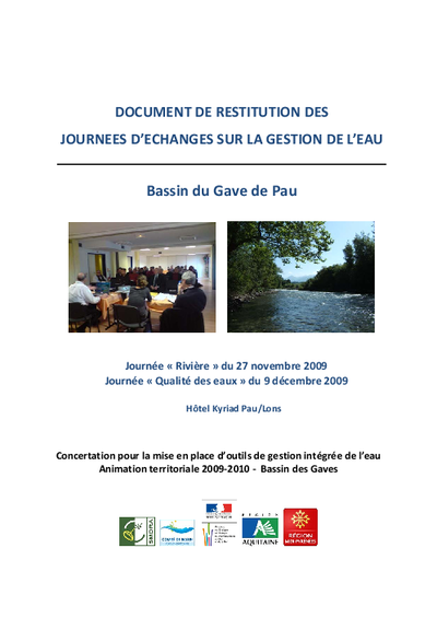 Document de restitution des journées d'échange sur la gestion de l'eau. Bassin du Gave de Pau. Journée Rivière du 27 novembre 2009; journée qualité des eaux du 9 décembre 2009. Concertation pour la mise en place d'outils de gestion intégrée de l'eau.