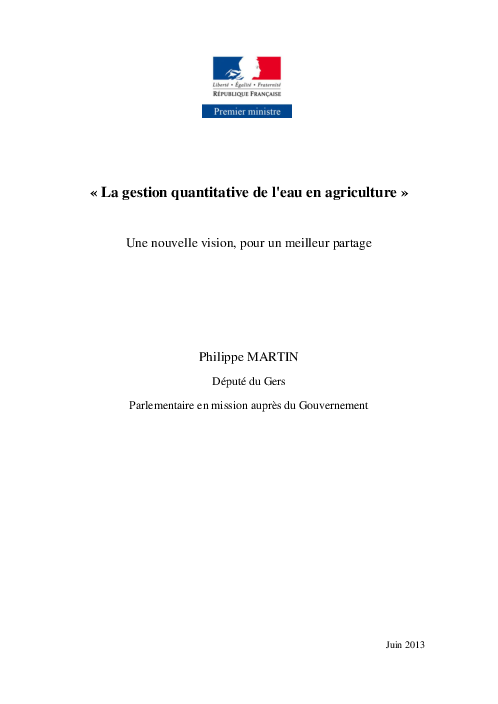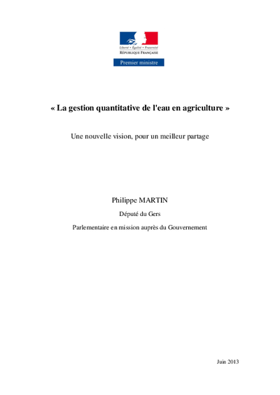 La mission confiée apr le gouvernement à Philippe Martin vise à "proposer une nouvelle mission pour la gestion quantitative de l'eau en agriculture, s'appuyant sur des modalités de partage de l'eau et favorisant les dynamiques locales". Le rapport confirme la nécessité d'une vision partagée entre protection des milieux, usages économiques et partage équitable dans le contexte d'un changement climatique. Il appuie la réforme des volumes prélevables, et incite à mieux définir les arbitrages enttre agriculteurs. Il convient surtout d'asseoir des dynamiques locales de consensus dépassant les affrontement nationaux stériles, sur la base des 3 piliers du développement durable.