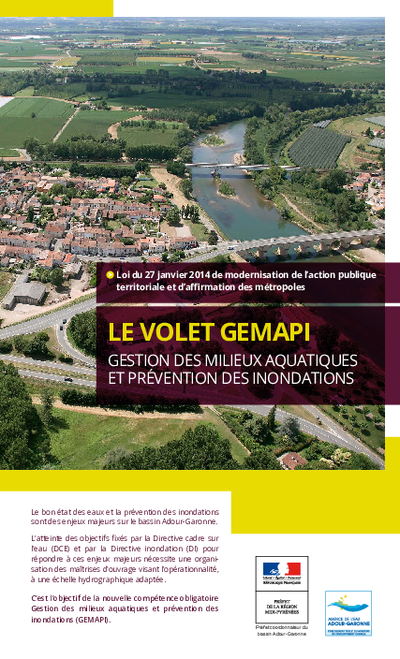 Cette plaquette sur la compétence GEMAPI met en avant le rôle des élus et la nécessaire cohérence des politiques publiques, et énumère les principes : - mettre en place des collectivités dotées de moyens techniques et financiers adaptés et assurant la prévention des inondations ainsi que la gestion des rivières et milieux aquatiques; - nétablir une gouvernance sur 3 niveaux : bloc communal, EPAGE, EPCI. On constate déja une mobilisation des acteurs locaux, en terme de regroupement de maitrise d'ouvrage, et de mise en oeuvre de Plans Pluriannuels de Gestion (PPG). Les principaux partenaires sont cités pour développer cette compétence en Adour-Garonne.