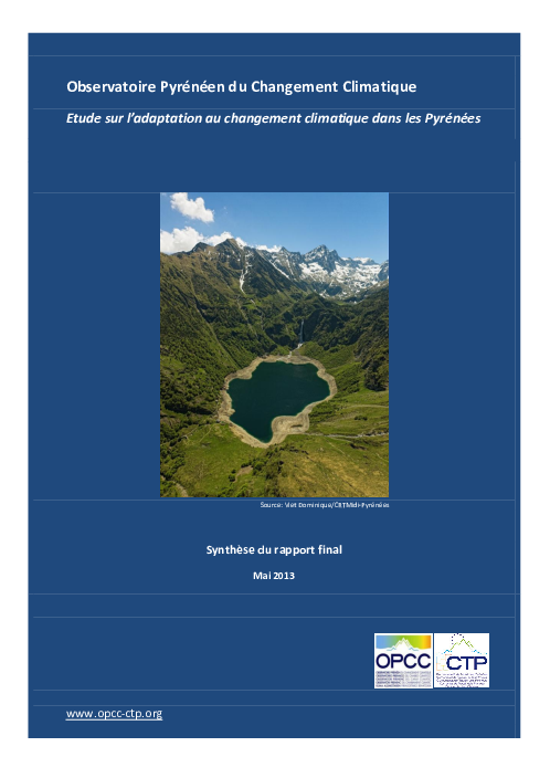 Le document constitue la synthèse finale de l'étude sur l'adaptation du changement climatique dans les Pyrénées menée entre août 2011 et avril 2013. Outre une description du contexte et des modalités de réalisation de l'étude, elle comprend une synthèse du profil pyrénéen de vulnérabilité au changement climatique élaboré à partir de la bibliographie existante, un bilan du recensement et de l'analyse des démarches d'adaptation pyrénéennes ainsi que sur d'autres territoires européens, des conclusions et des recommandations.