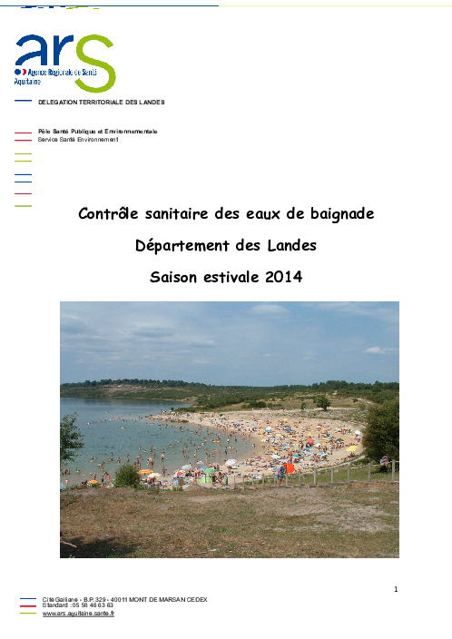 Le contrôle sanitaire des eaux de baignade est exercé annuellement par l'ARS. L'organisation de la surveillance est décrite à travers le contexte réglementaire, les risques sanitaires, le programme de contrôle et la diffusion des résultats. Les résultats de la saison 2014 sont présentés. 70 sites de baignades dont 45 en eau de mer, 22 en eau douce et 3 baignades artificielles sont contrôlés. Toutes les eaux de baignade sont conformes à la directive européenne de 2006. Ces résultats témoignent de la "bonne qualité" des eaux du littoral landais et de la bonne coordination des acteurs dans la gestion des fermetures préventives des plages.