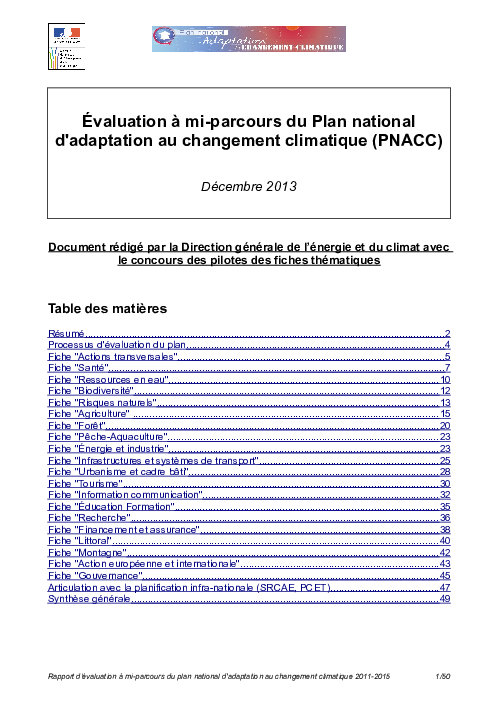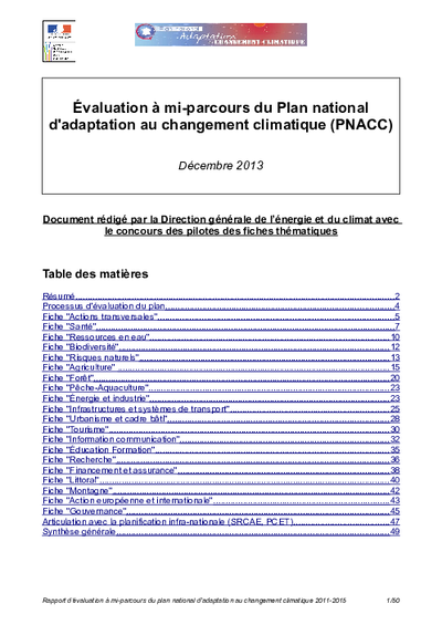 L'évaluation à mi parcours du PNACC est plutôt satisfaisant. 92% des actions prévues ont démarré, 60% du budget identifié a été engagé, 60% des actions sont en phase avec les objectifs initiaux, 5% des actions sont ajournées, 35% des actions pourraient n'atteindre qu'une partie des objectifs initiaux.