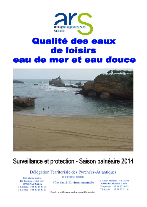 Qualité des eaux de loisirs en eau de mer et eau douce. Surveillance et protection. Saison balnéaire 2014. Pyrénées-Atlantiques.