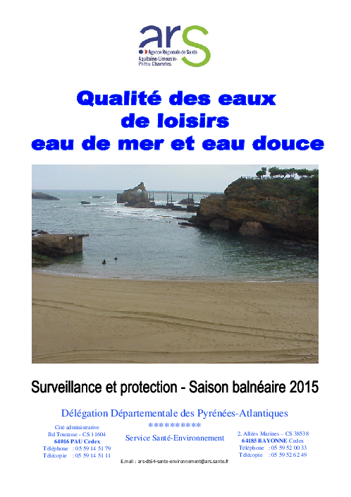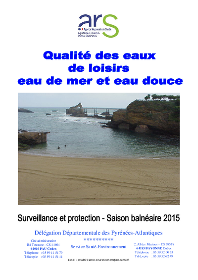 Qualité des eaux de loisirs en eau de mer et en eau douce. Surveillance et protection. Saison balnéaire 2015. Pyrénées-Atlantiques.