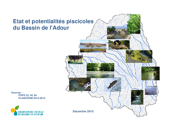Une mise à jour de l'Atlas du bassin de l'Adour est réalisé sur les potentialités piscicoles à partir des PDPG actualisés, outils réglementaires pour la gestion piscicole et le PLAGEPOMI. Le bassin de l'Adour offre un fort potentiel. On constate une dégradation des cours d'eau cyprinicoles. Les pressions sont multiples : activité agricole, hydroélectricité, rejets domestiques, perturbations hydromorphologiques. L'amélioration de la qualité de l'eau et des milieux et une gestion patrimoniale sont préconisées.