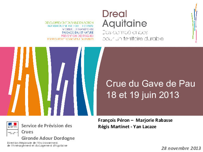 Retour d'expérience sur la crue du Gave de Pau du 18/19 juin 2013. Il aborde les conditions météorologiques et nivologiques présentes, les diagrammes de crues du Gave à différents endroits, et les dégats subis.