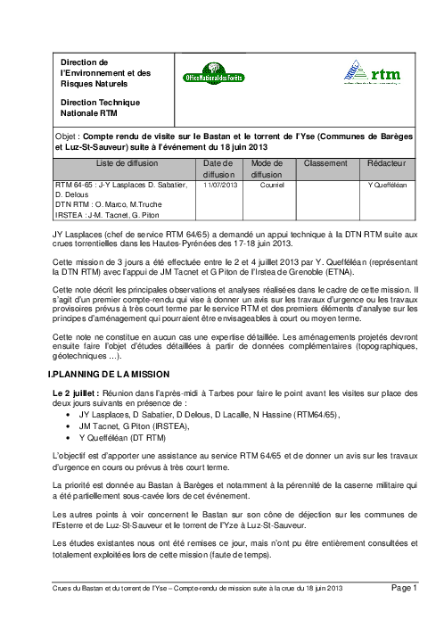 Compte rendu de la visite sur le BASTAN et le torrent de l'YSE (Communes de Barèges et Luz-Saint-Sauveur) suite à l'évènement du 18 juin 2013
