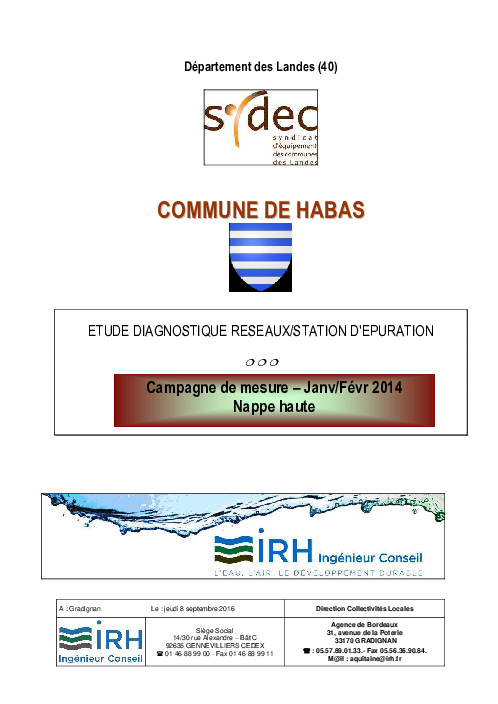 L'étude diagnostique porte sur : · la réalisation d’un diagnostic du fonctionnement du système d'assainissement du bourg de la commune de Habas, · la réalisation d'un schéma directeur d'assainissement.