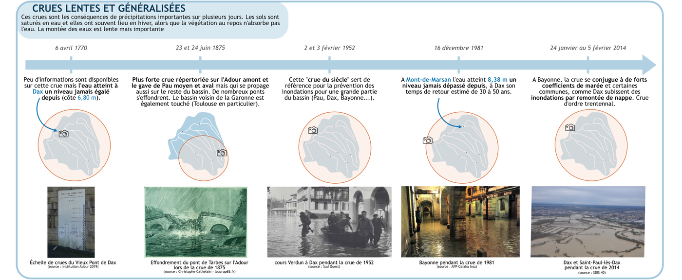 La présence de l'eau et d'enjeux humains implique plusieurs risques d'inondations sur le bassin de l'Adour : débordement des cours d'eau, submersion marine, remontée de nappes, ruissellement.